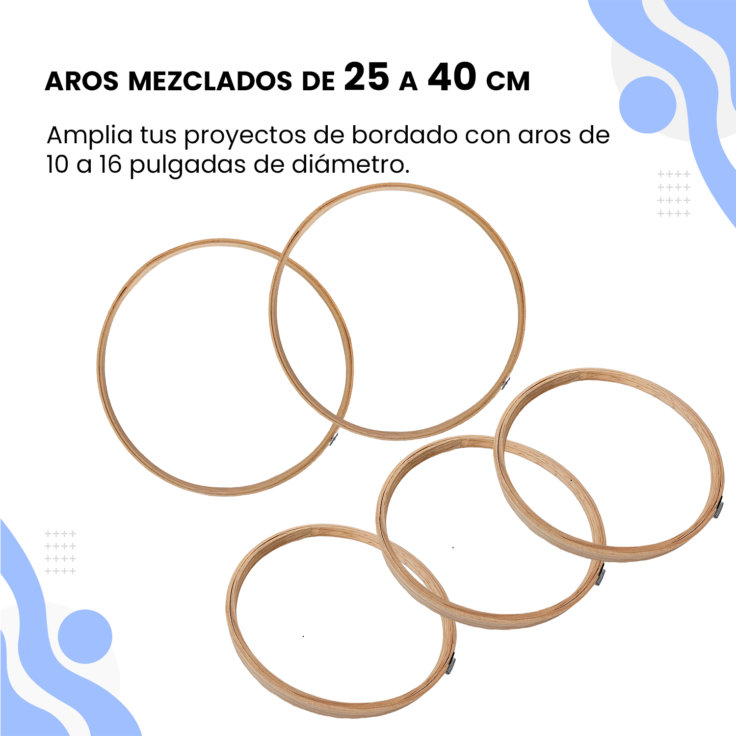 Aros mezclados, ideales para talleres de bordado que buscan calidad y funcionalidad en su práctica. Con un diámetro de 25 cm a 40 cm, permiten trabajar con proyectos de mayor tamaño, brindando un soporte óptimo para tus diseños. Su forma redonda facilita el manejo y la manipulación de la tela, asegurando que cada puntada sea precisa y cuidada.