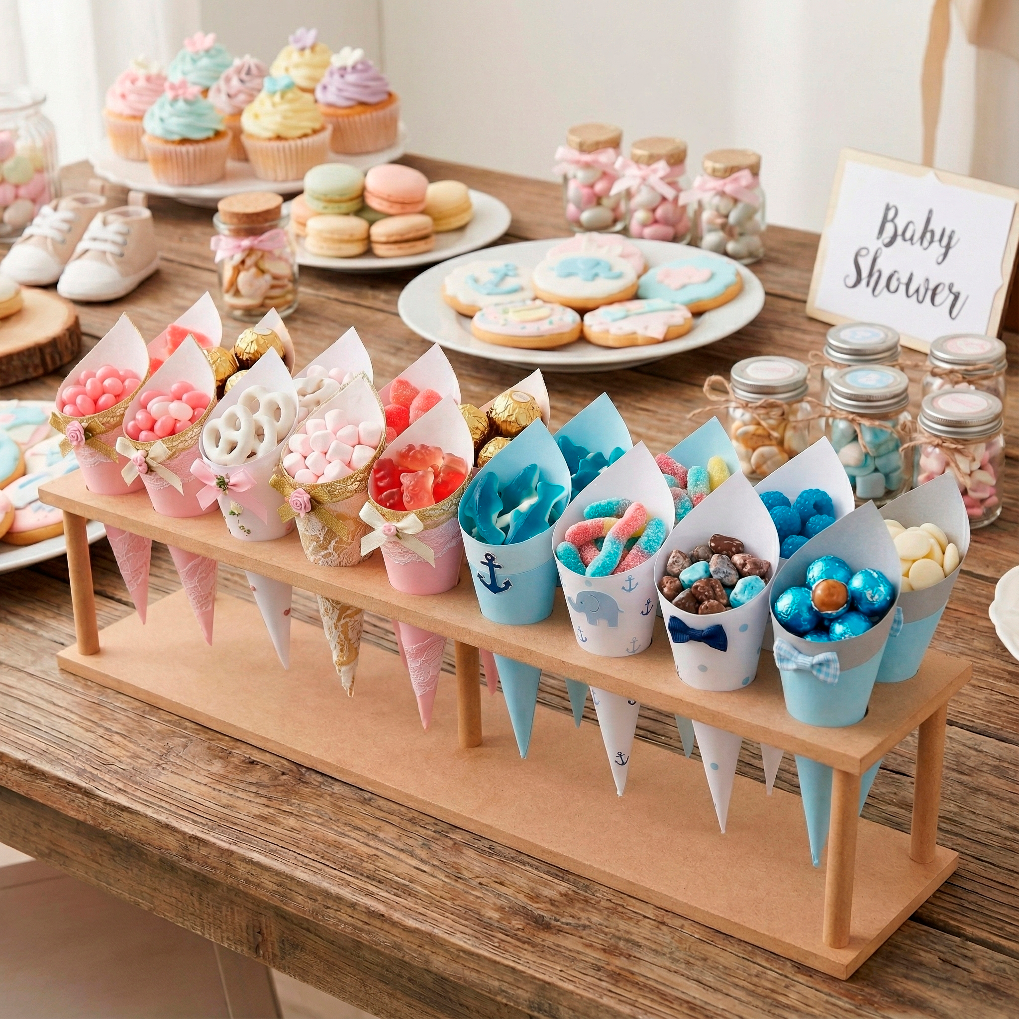 Fabricada en madera MDF, su diseño versátil es ideal para mesas de dulces, cumpleaños, fiestas infantiles y cualquier evento que requiera un toque especial. Al no estar pintada, ofrece la posibilidad de personalizarla según el tema de tu celebración, permitiendo que tu creatividad brille en cada detalle.
