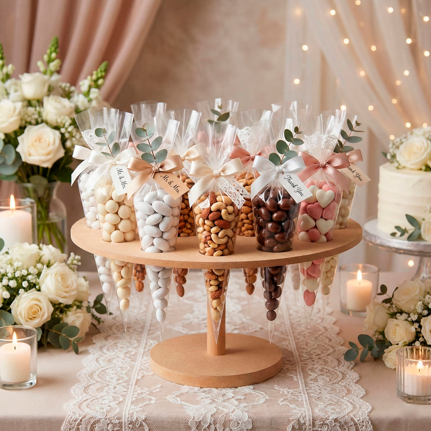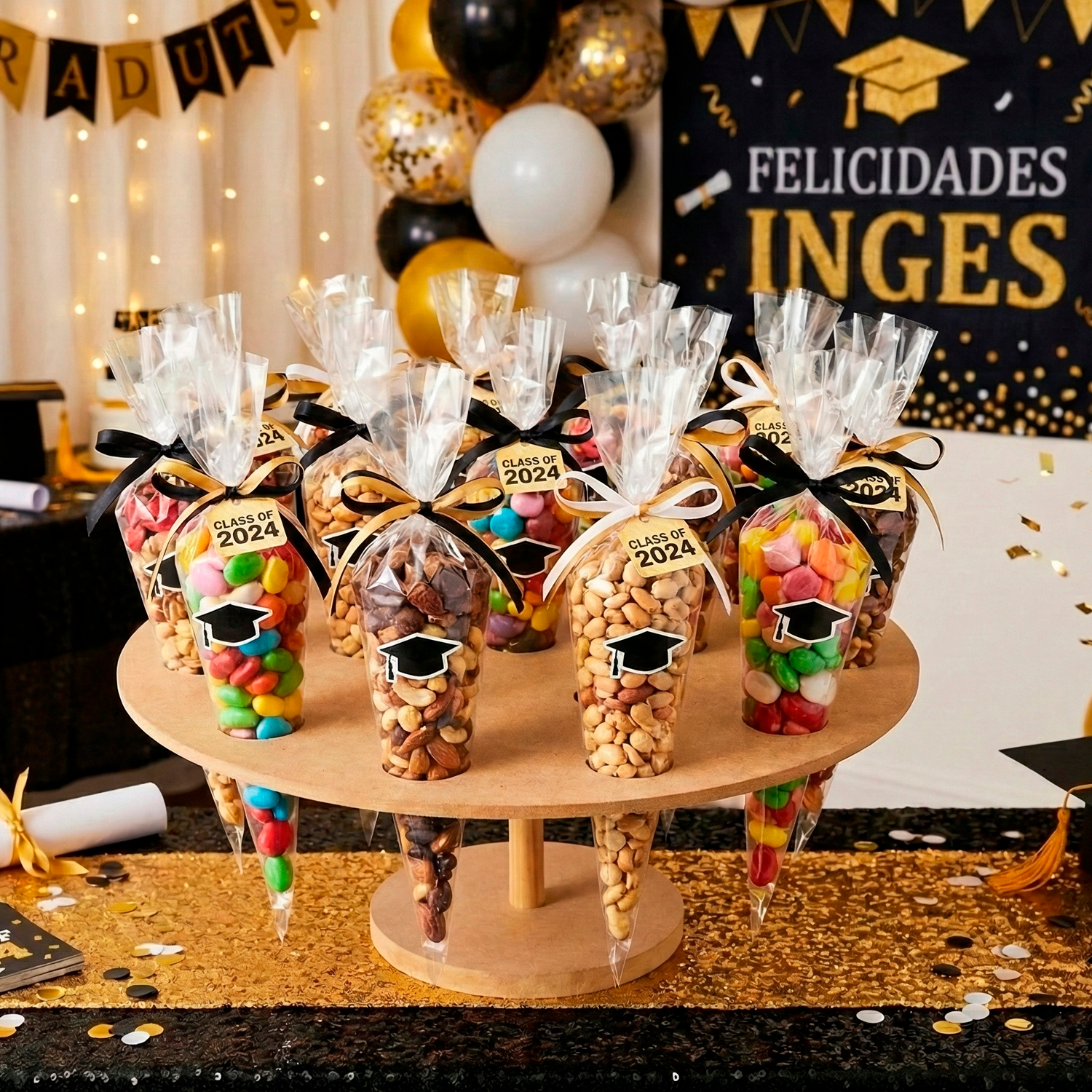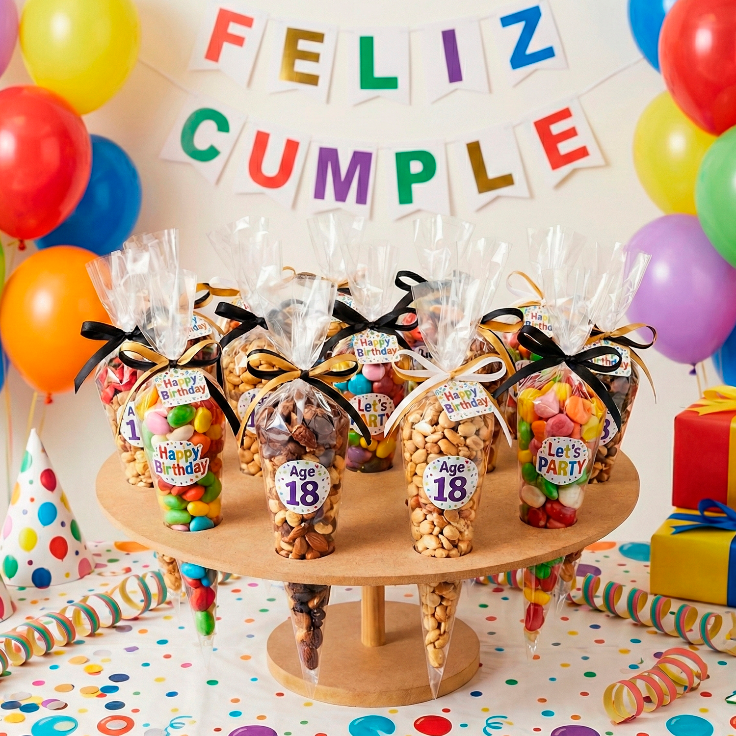 La Base Para Conos de madera MDF es la solución ideal para quienes buscan una presentación elegante y funcional en sus mesas de dulces. Con un diseño que incluye 15 hoyos, permite exhibir conos de dulces y botanas de manera ordenada y atractiva, ideal para fiestas, eventos y celebraciones.