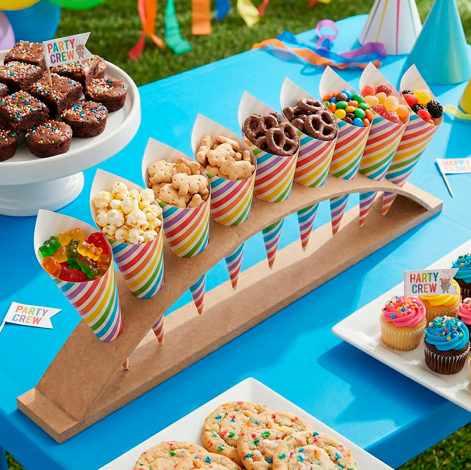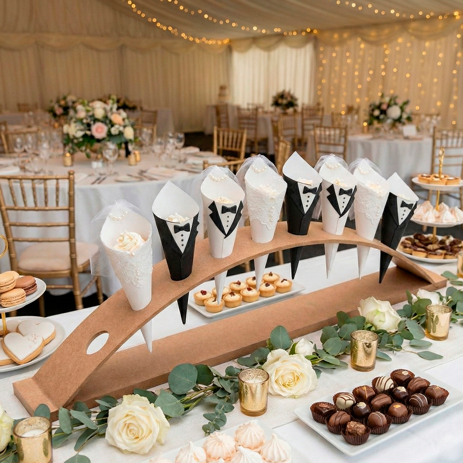 Diseñada para facilitar la presentación de dulces y decoraciones en eventos, su forma curvada permite una exhibición elegante y funcional. Su acabado en madera MDF proporciona un aspecto natural que se adapta a diversos estilos decorativos, desde fiestas infantiles hasta celebraciones más sofisticadas.