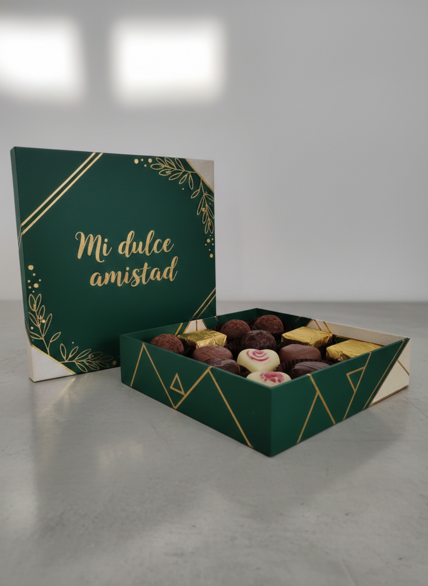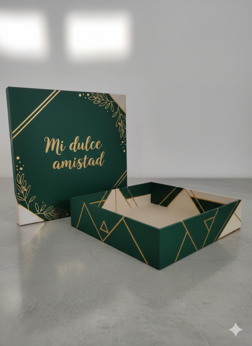 La tapa de la caja proporciona una protección adicional, manteniendo el contenido seguro y fresco. Su estética atractiva la convierte en una opción perfecta para presentaciones en eventos, regalos o simplemente para mantener tus dulces organizados en casa. Esta caja es una excelente elección para quienes buscan funcionalidad y estilo en el almacenamiento de sus delicias.