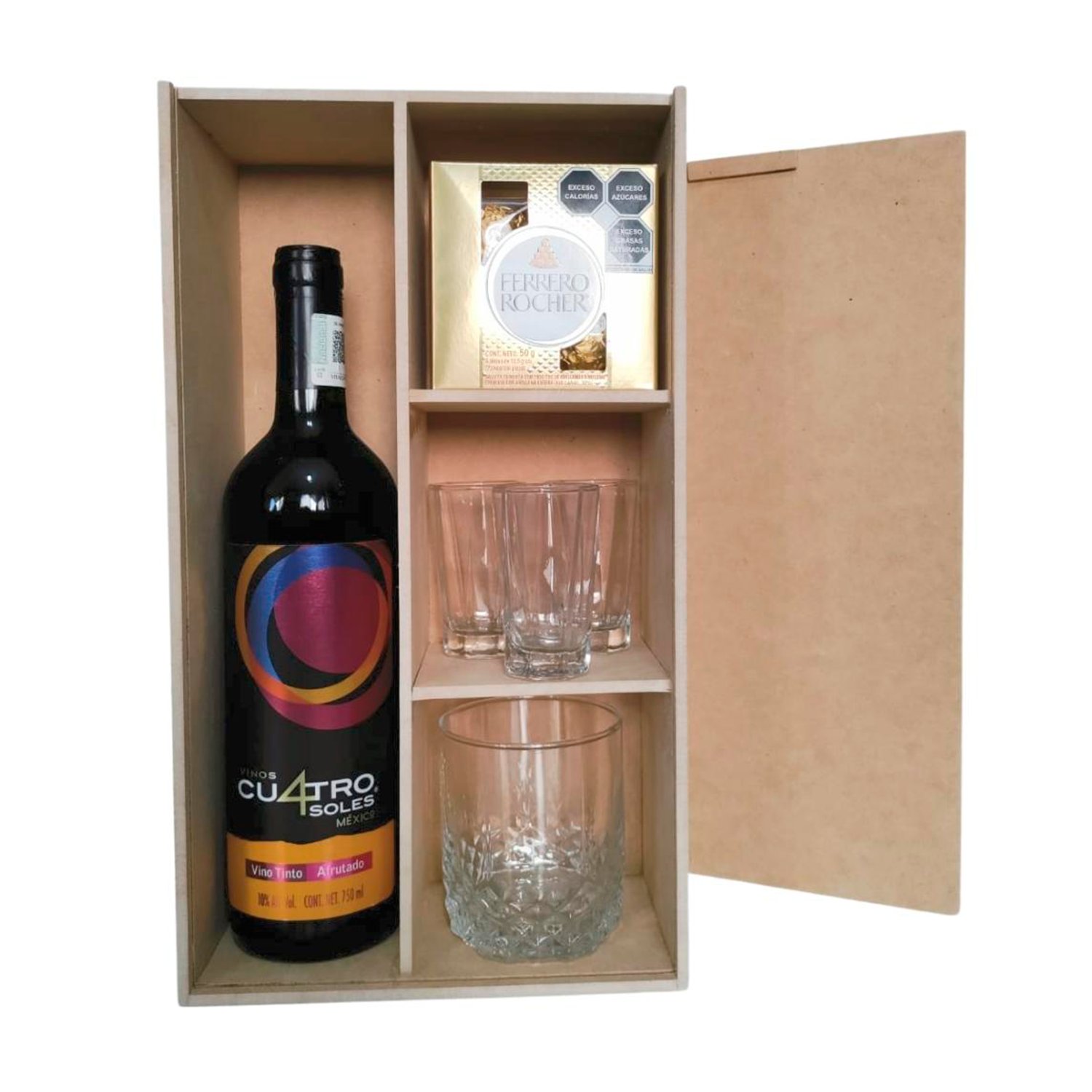 La Caja Para Botella De Vino Con Divisiones es la solución ideal para quienes buscan un soporte elegante y funcional. Con dimensiones de 30 cm de altura, 20 cm de largo y 10 cm de ancho, este producto está diseñado para albergar una botella ya sea de vino, tequila u otro destilado, ademas de tres espacios para albergar un vaso tequilero, botanas y acompañamientos de preparación, manteniéndolas organizadas y seguras.