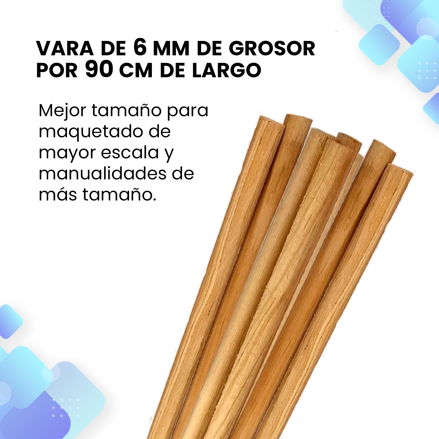 Ya sea para construir modelos artesanales con vara de madera, realizar manualidades o complementar decoraciones, su grosor y longitud aportan flexibilidad y resistencia.