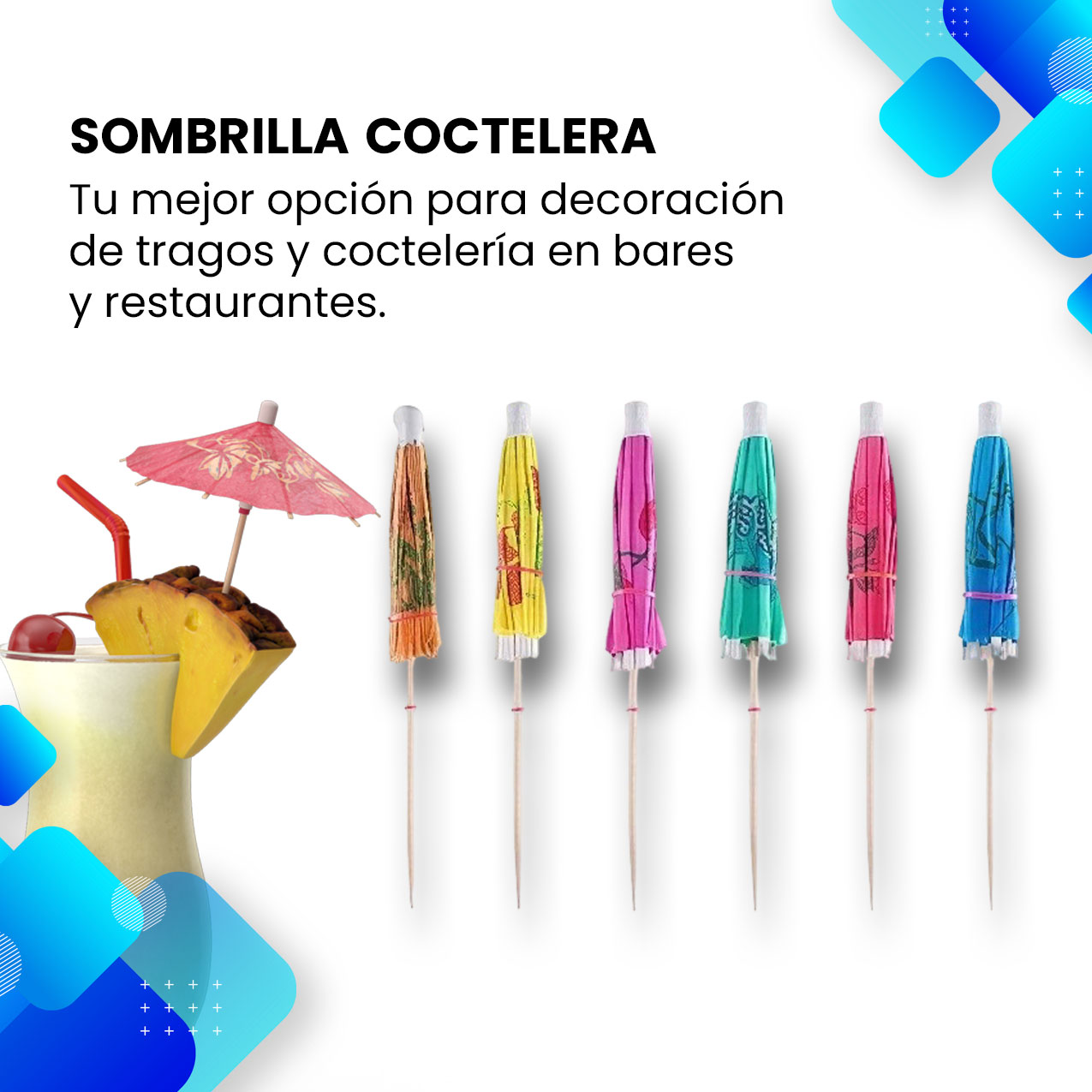 Perfecta para bares, restaurantes o reuniones familiares, esta sombrilla coctelera es un elemento esencial para quienes buscan realzar la presentación de sus bebidas. Con un largo de 10 cm, se adapta a una amplia variedad de vasos y copas, haciendo que cada bebida sea especial. Dale un giro a tus eventos y sorprende a tus invitados con este detalle encantador.